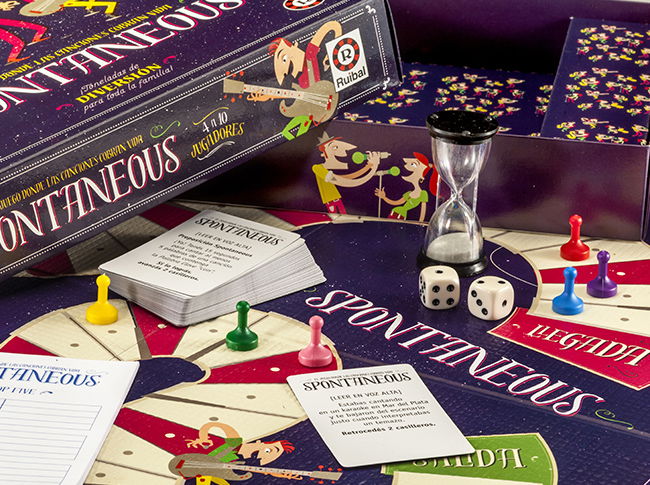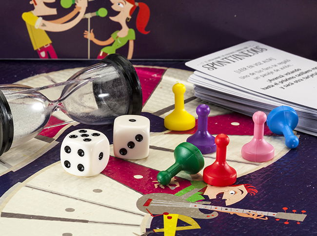 Contenido: 1 tablero, 6 peones, 50 tarjetas, 1 reloj de arena, 1 block de hojas, 2 dados y 1 reglamento.
