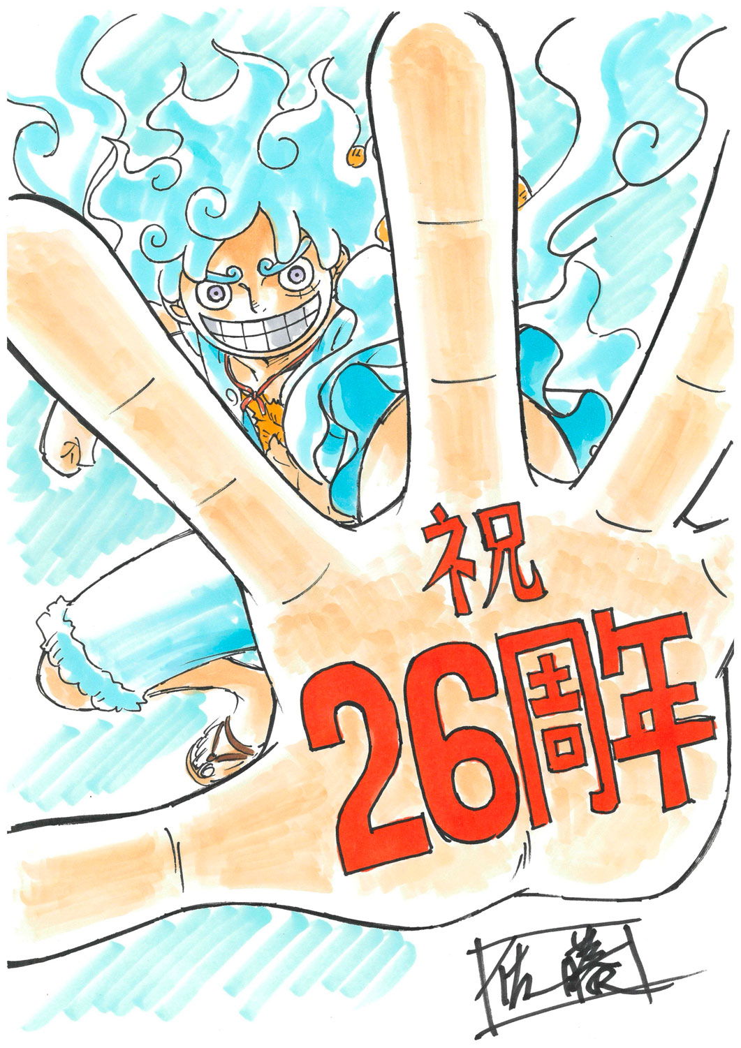 El arte revelado es un vibrante retrato de Luffy en su forma de Gear 5, sonriendo de oreja a oreja y desbordando libertad. La ilustración fue creada nada menos que por Masayuki Sato, una leyenda viviente de la serie. Sato ha sido una pieza clave en la historia del anime, habiendo trabajado como director de animación y diseñador de personajes en varias películas, e incluso participando en la animación del primer opening de la serie, el icónico "We Are!".